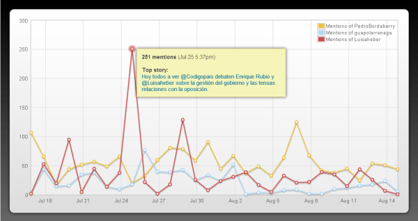 Menciones en Twitter de @PedroBordaberry, @guapolarranaga y @Luisaheber entre el el 17 de julio y el 15 de agosto